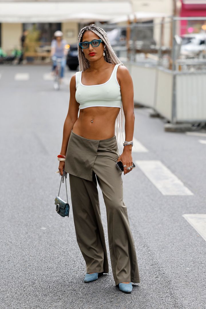 昨年に引き続きオフランウェイで多くみられるのが、チャンキーなカラーフレームやオーバルタイプ。タンクトップやブラトップで夏らしくアクティブにキメるなら、目もとも大胆にデコレーションしてみたい。クールな眼差しを演出するブルーのクリアフレームは投入するだけでエッジが加わり、いつもの着こなしをモードに昇華してくれる。