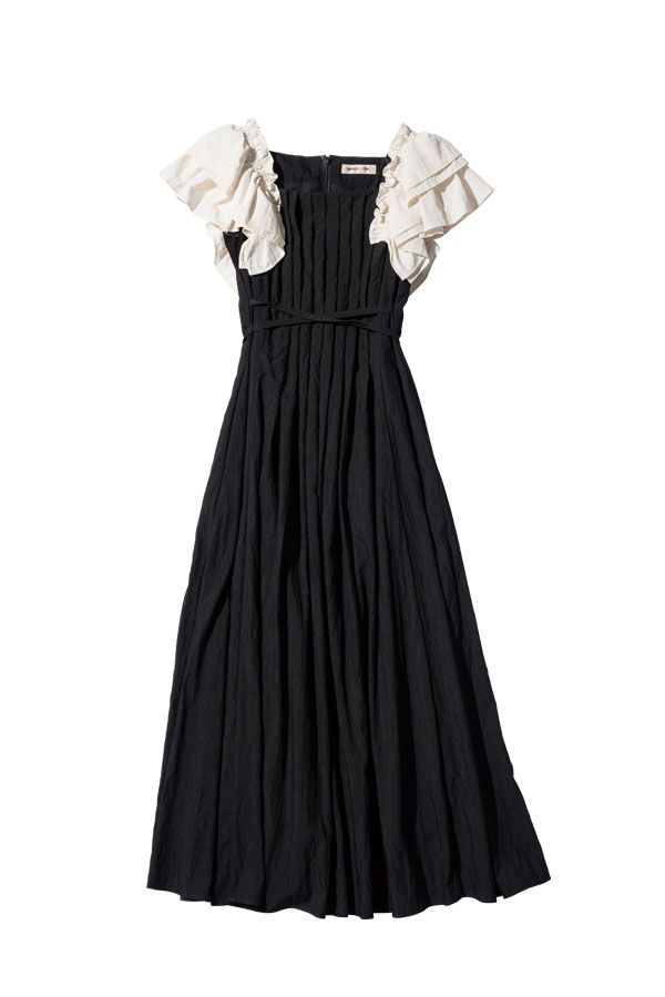 ショルダーフリルのアクセントと、フロントタックの縦ラインですらりとした印象をメイク。