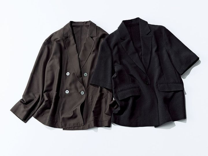 頼れるコスパで真夏の気温差にも対応。(左から)グレーシアジャケット¥7,698(グローブ/ワールド プレスインフォメーション)、ブラック半袖ジャケット¥6,996(ロペピクニック/ベイジュ)