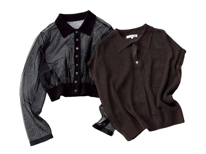 抜けとセンスで送迎スタイルに新風を。(左から)クロップドシアシャツ¥6,930(STYLEMIXER)ブラウンメッシュニットポロ¥4,398(グローブ/ワールド プレスインフォメーション)
