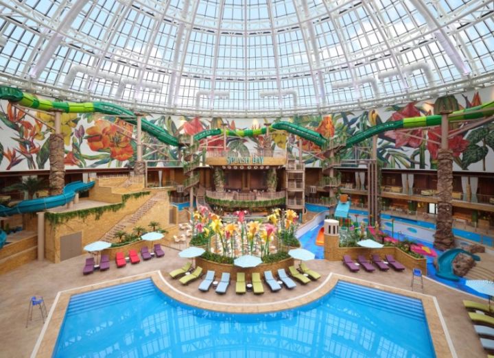 ガラスドームの上部に360度張り巡らされたスライダーを高速で回転するスリル満点の「アクア・レーサー」、長いパイプの中を滑り降りる「スプラッシュ・ツイスター」など迫力満点のウォータースライダーも!