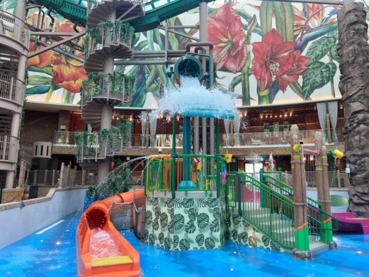 水深の浅いキッズゾーン。安心して遊べつつ、滑り台や大量の水が落ちてくるバケツなどワクワクするような仕掛けやアトラクションに子どもたちも夢中♪