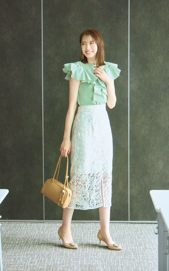 華ブラウス×レースを清涼配色でオフィス向きに。