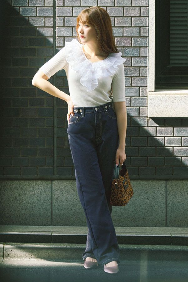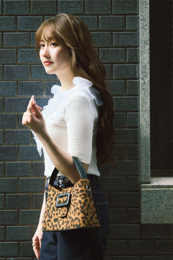 フリルをたっぷりあしらった盛りトップスとの合わせで、迫力のあるヒョウ柄をフェミニンに昇華。