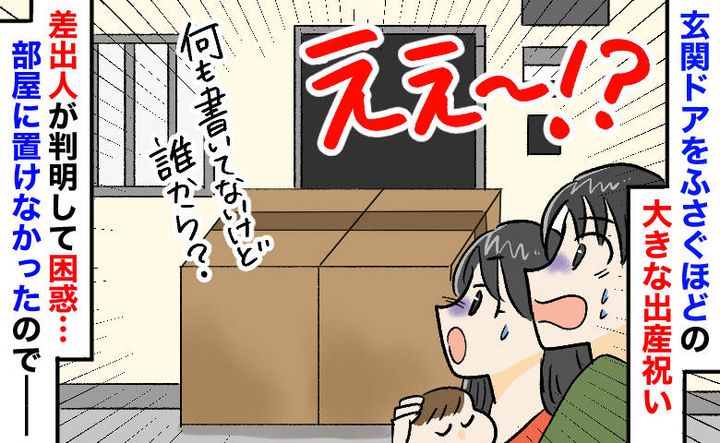 子どもが生まれてしばらくたったころ。私たちが留守にしていたとき、玄関前に大きな出産祝いが置かれていました。差出人などは書かれておらず……。