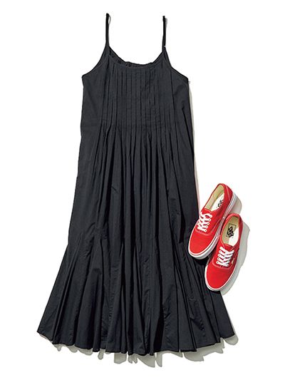 「1枚着るだけで、リラックス感と大人の品を両立できる黒ワンピースが軸。赤のVANSでカジュアルダウンしながら、手抜きに見せないアクセントに」(スタイリスト・渡邊恵子さん) 黒キャミソールワンピース/フリークス ストア(フリークス ストア渋谷) 赤スニーカー/VANS(VANS JAPAN カスタマーサポート)