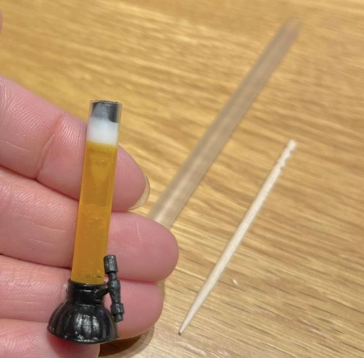 ビールが入っている筒はストローを使いました。黒いつまみはつまようじの上の部分を黒く塗りました。ピッチャーから注がれているジョッキの液体と泡の割合はもちろん7:3。ジョッキからこぼれでる泡で躍動感を出しました♪