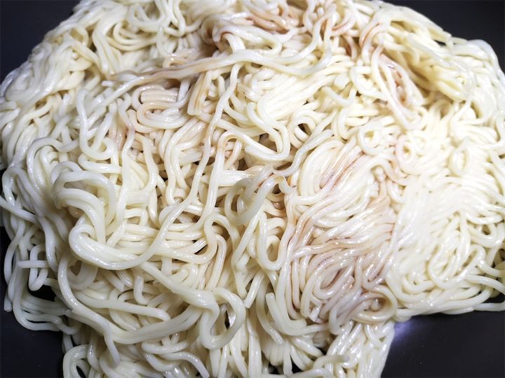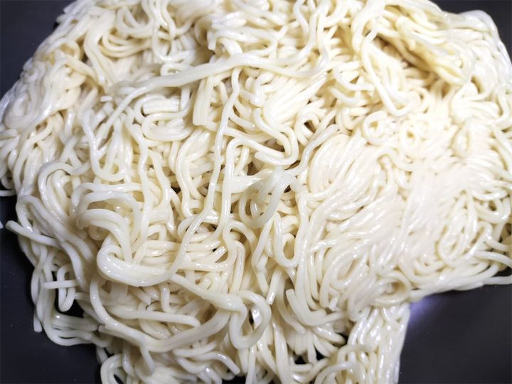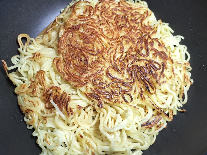 5. 麺を動かさずに焼き、焼き目がしっかりついたら裏返します。