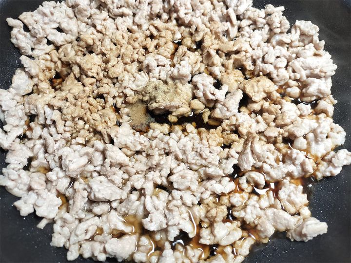2. 豚肉が白くなったら紹興酒、甘しょうゆ、こしょうを加え、豚肉に水分を吸わせるように炒めて取り出します。