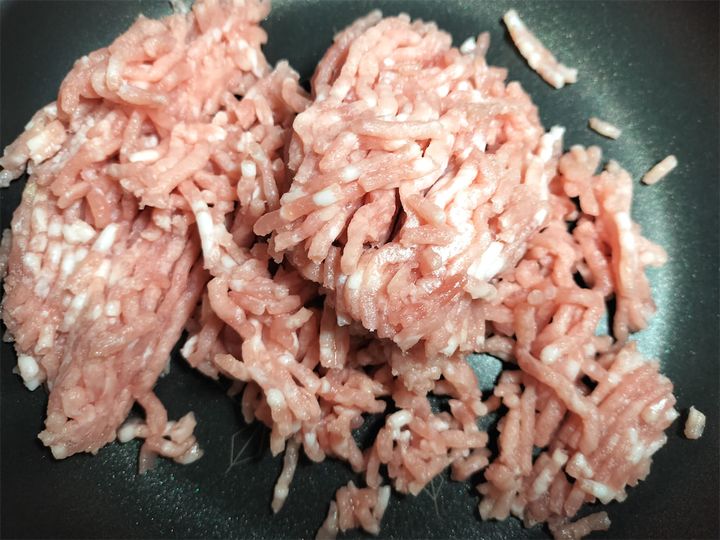 1. フッ素樹脂加工のフライパンに油をひかずに豚ひき肉を入れ、強火で炒めます。