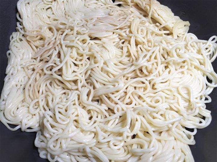 4. 麺全体に紹興酒としょうゆをかけます。