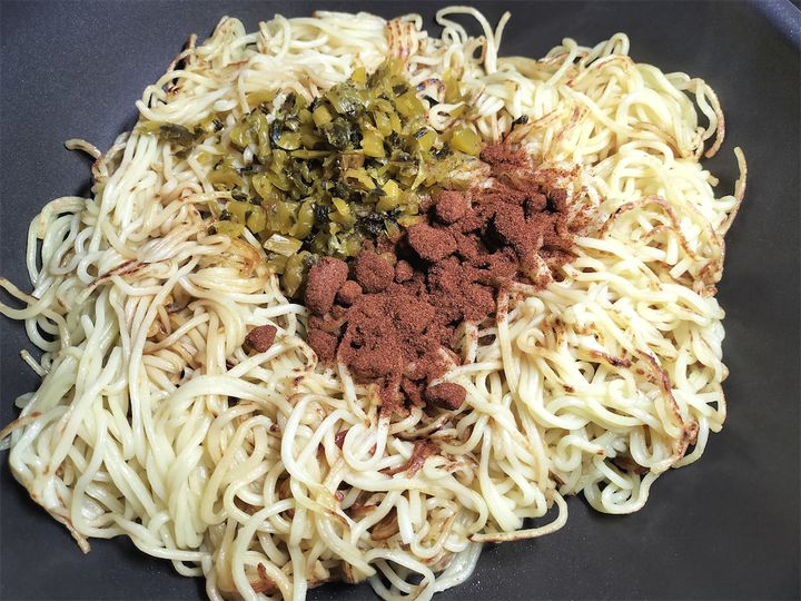 7. 麺が入っているフライパンの火を止め、鶏ガラスープ、しょうゆ、オイスターソース、甘しょうゆ、酢、ヤーツァイ、唐辛子を加えます。
