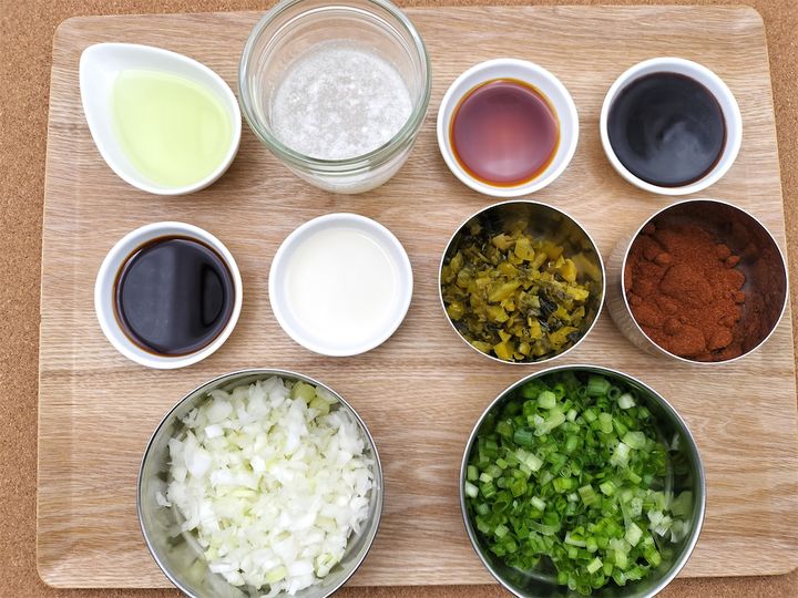 このレシピで使われるヤーツァイという聞きなれない漬物は、中国では芽菜と書きます。文字の通り青菜の若芽を漬物にしたもので四川料理ではよく使われますが、青菜にもたくさん種類がありますので、どの青菜の若芽かは、正確には分かりません。日本のスーパーではおそらく見たことがないのですが、なんとなく文字面を見ていたら中華街の食材店のパッケージで見たことがあるような気がしてきましたので、今度中華街へ行ったときに探してこようと思います。知らない食材って、なんとなくワクワクしてしまうのはわたしだけでしょうか?