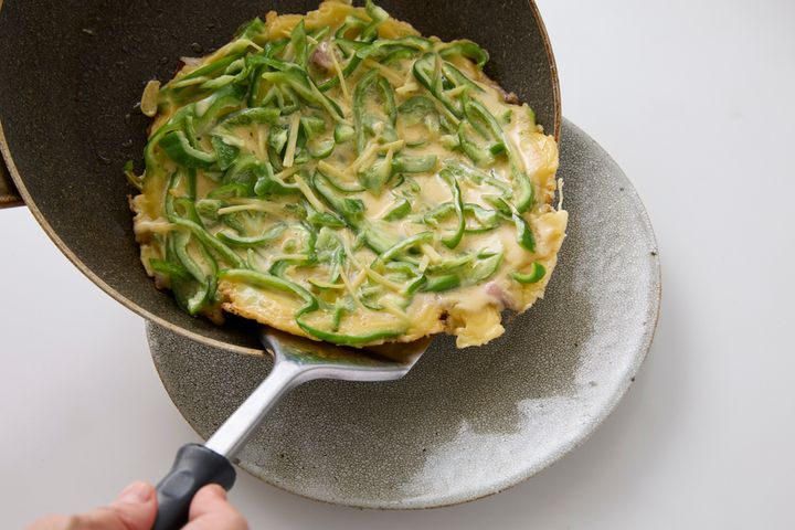 うまみ満点の豚バラと、旬のピーマンをたっぷり使った食べごたえ満点のチヂミ。キムチを添えて、チヂミといっしょに食べることで、味がビシッと決まります。ご飯もビールもどんどんすすむ、夏におすすめの一品です!