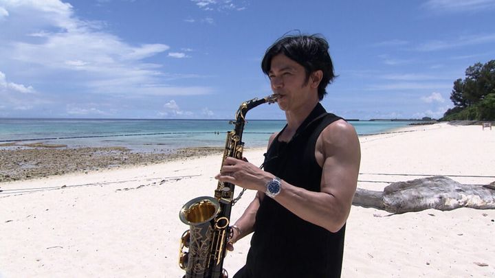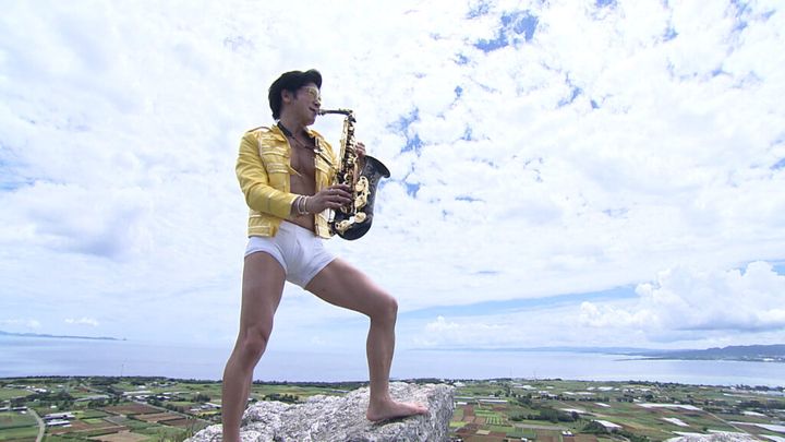 まずは、伊江島の中央にそびえる島のシンボル、城山へ向かう。360度のパノラマが楽しめる頂上では、往年の美ボディアーティスト、クイーンのフレディ・マーキュリーをオマージュ。フレディの衣装でサックスを吹き、観光客と盛り上がる!