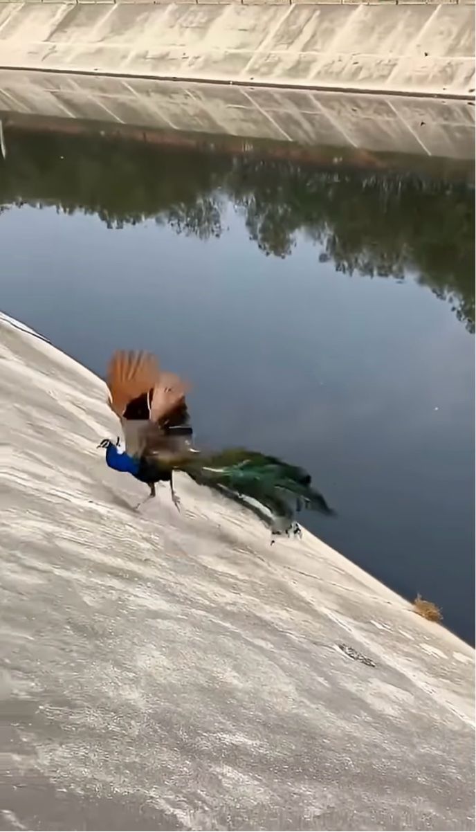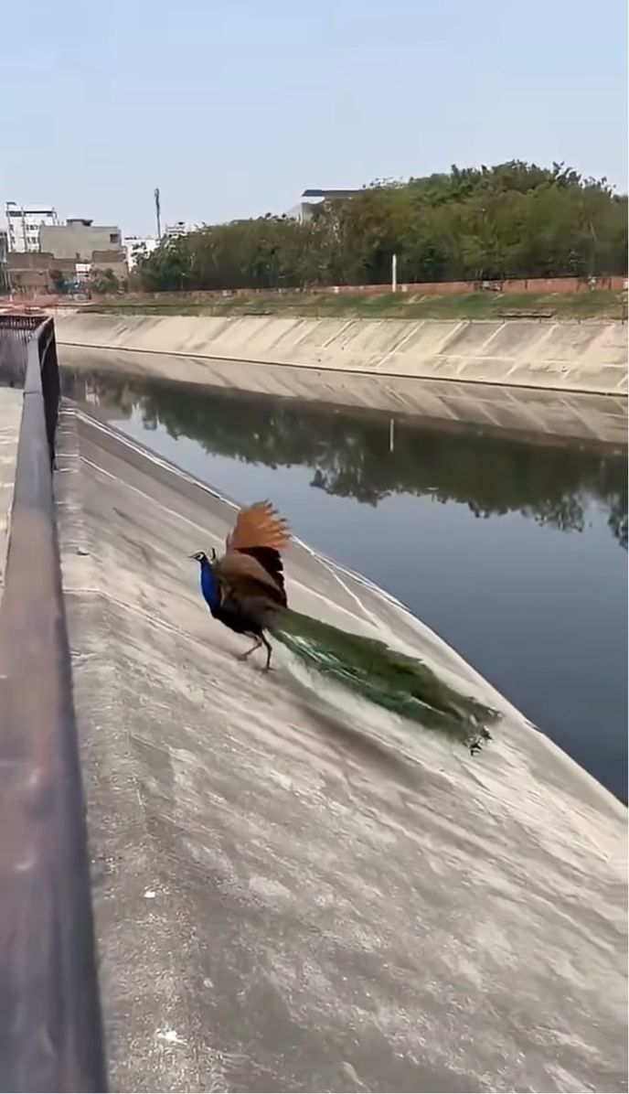 水路脇にいるのを発見された一羽のクジャク。 斜面をよじ登って岸にあがろうとしていますが、あまりにも急勾配なため自力での脱出は難しそうです!