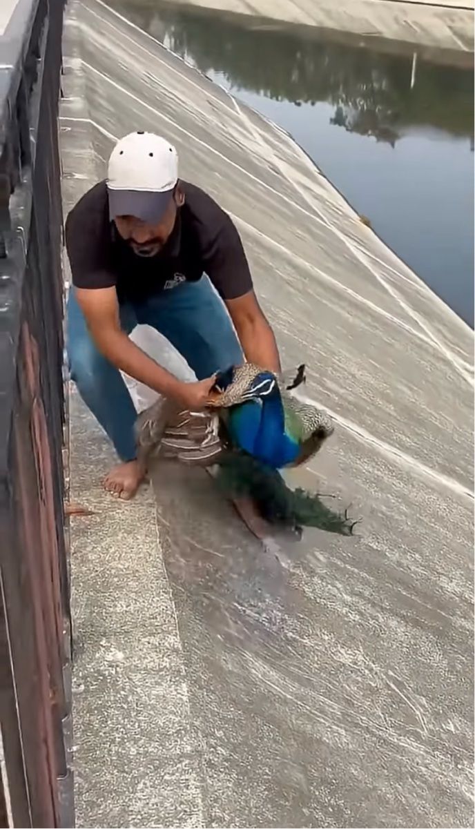そして、この男性はそのままクジャクを安全な岸まで運んであげました! こうして、クジャクは見事に窮地から救い出されたのでした。