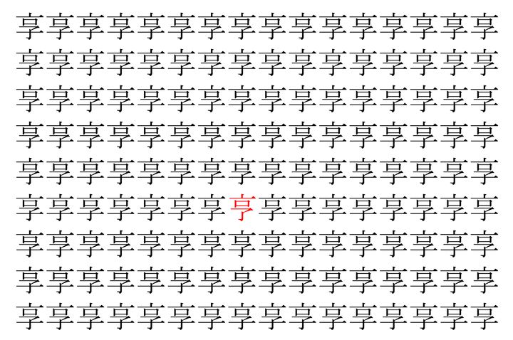 画像の中には、「享」という漢字が縦に9行、横に16個並んでいます。 全部で144個となりますが・・・、そのうち1つは「異なる漢字」となってますよ!!