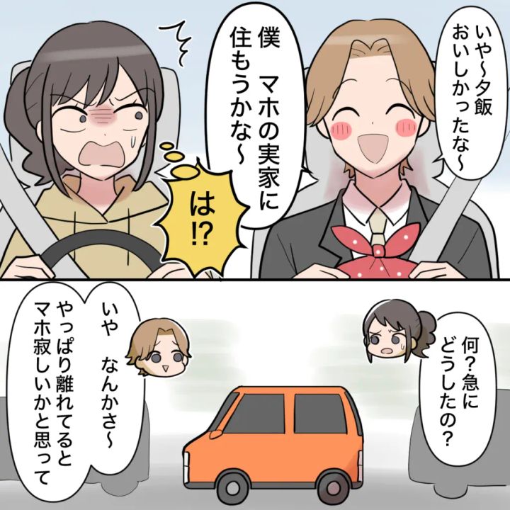 そして帰りの車の中で突然、「いや~夕飯おいしかったな~。僕、マホの実家に住もうかな~」と言い出し、「は!?」と心の中で叫ぶ私。「何?急にどうしたの?」とたずねると、「いや、なんかさ~、やっぱり離れてるとマホ寂しいかと思って」と言い出すオサムに、