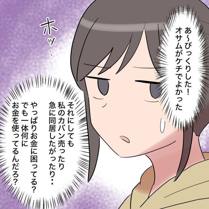 私はというと、「あ~びっくりした!オサムがケチでよかった。それにしても、私のカバン売ったり、急に同居したがったり・・。やっぱりお金に困ってる?でも一体何にお金を使ってるんだろ?」頭の中でぐるぐると考え続けていました。
