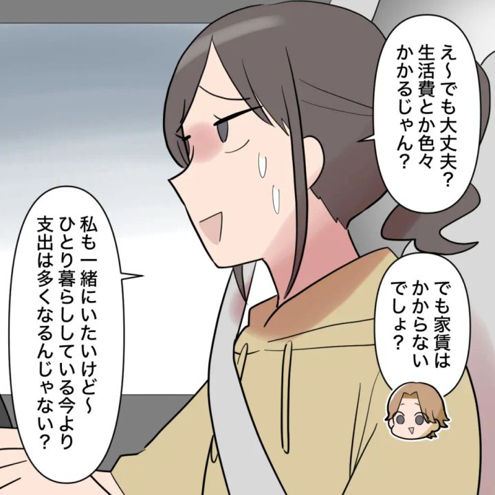 「え~でも大丈夫?生活費とか色々かかるじゃん?」と言うと、「でも家賃はかからないでしょ?」とオサムに言われ、「私も一緒にいたいけど~、ひとり暮らししている今より支出は多くなるんじゃない?」と言うと、