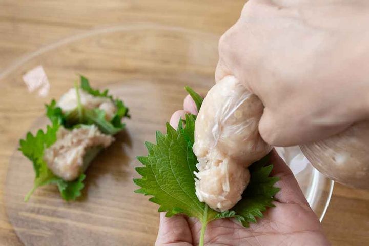 2、混ぜた肉だねを大葉の上に絞り出し、包みます。耐熱皿の上に並べます。