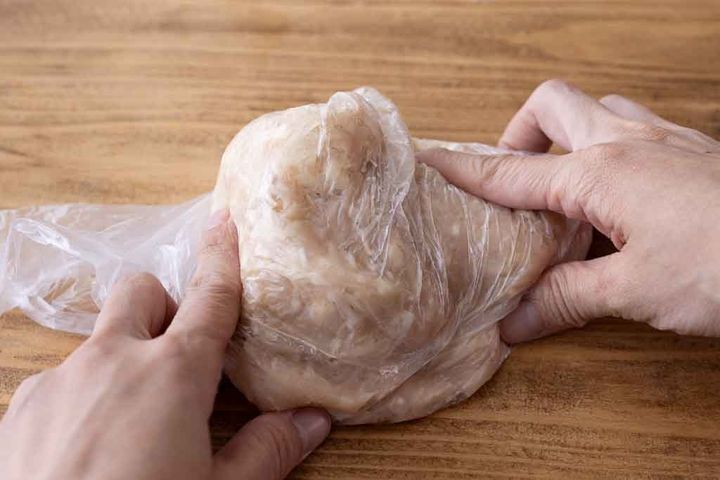 1、ポリ袋に鶏ひき肉、1cm幅に切ったえのき、<A>を入れ、粘りが出るまでよく混ぜます。