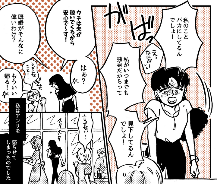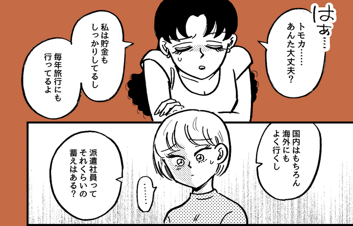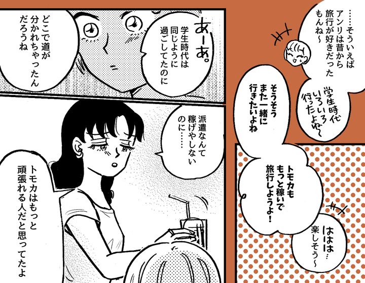 「もっと稼いでまた一緒に旅行しようよ〜! 学生時代は同じように過ごしてたのに、どこで道が分かれちゃったんだろうね。トモカはもっと頑張れる人だと思ってたよ。派遣なんて稼げないし……」と、言ってきたアンリに私もついに堪忍袋の緒が切れて……言ってはいけないひと言を言ってしまったのです。