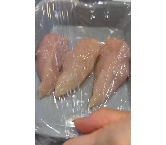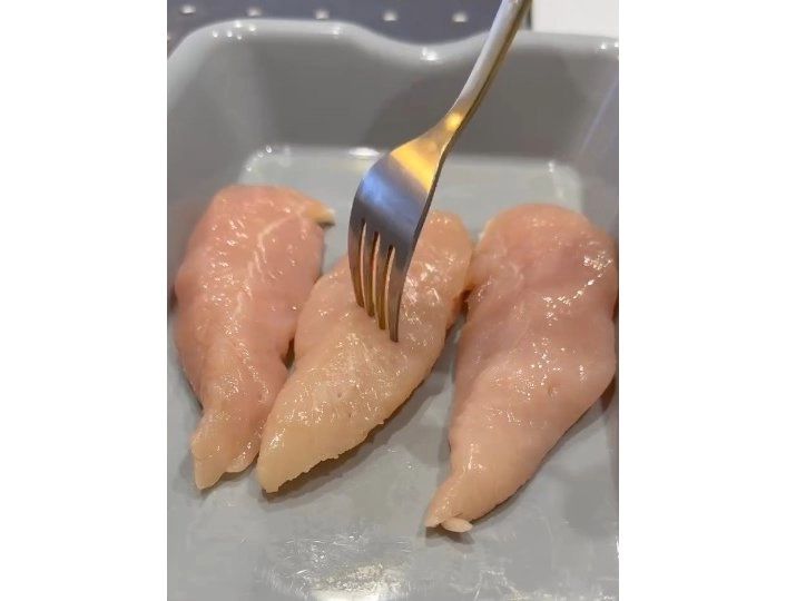 耐熱皿にささみを移し、フォークでランダムに穴を開けてください。