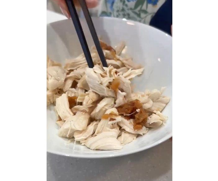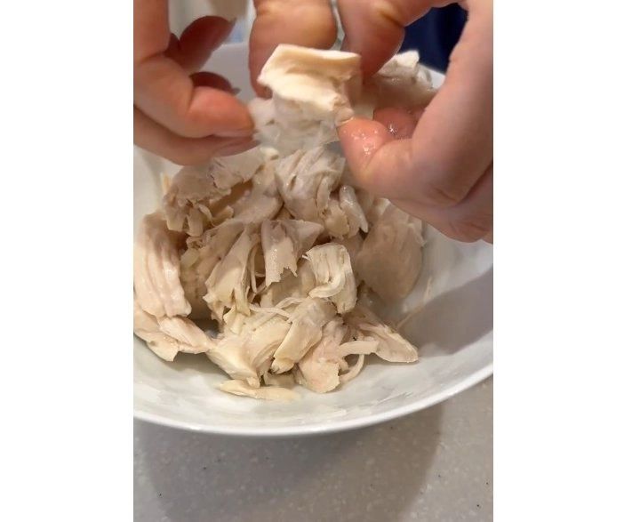 2で加熱したささみを別皿にあけ、細かく裂いていきます。