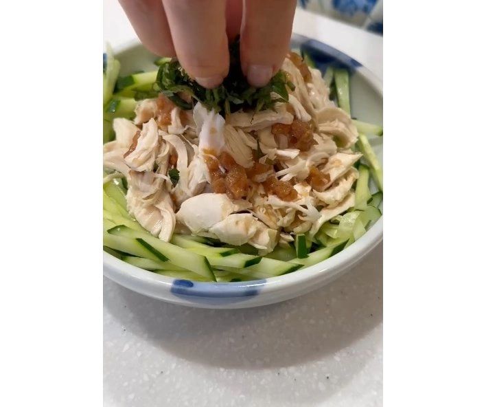 大きめのお皿にきゅうり→ささみと梅→大葉の順に盛りつけて完成です!