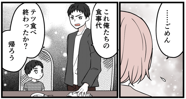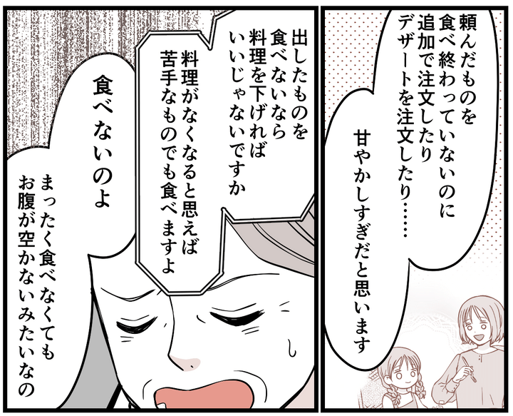 私はアヤコ。夫ユウキと幼稚園に通う息子テツの3人家族です。義姉ミサキさんの娘タエちゃんは外食で注文したものを食べ残すことが多く、義姉は残ったものを夫やテツに食べさせようとします。それだけでなく、残したのに好きなものやデザートを追加注文するのです。ある日、夫とテツが義姉に指摘したことにより、食事会はシーンとした雰囲気になってしまいました。私は間違ったことを言っているとは思えないのですが……。