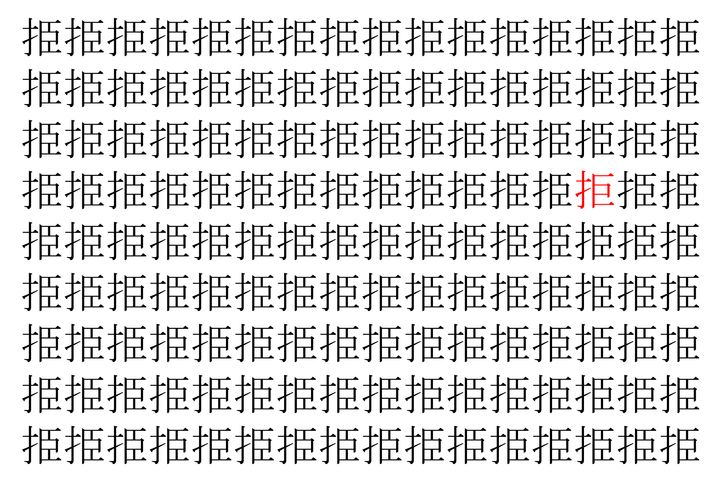 画像の中には、「挋」という漢字が縦に9行、横に16個並んでいます。 全部で144個となりますが・・・、そのうち1つは「異なる漢字」となってますよ!!