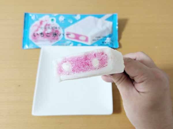 小さいころよく食べていたいちごフロートをバーにしたようなこの商品で、懐かしい味! 周りはあまいミルク感、中には練乳が入っているので、「いちご練乳かき氷」を食べているような感覚になります。