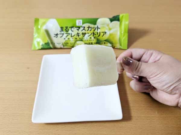 2025年7月に登場したこの商品。あの“ぶどうの女王”マスカット・オブ・アレキサンドリアの果汁を72%も使用していて、贅沢すぎるアイスバーです。外側はシャリシャリと氷を食べているような食感ですが、内側はねっとりとした濃厚な味わい。