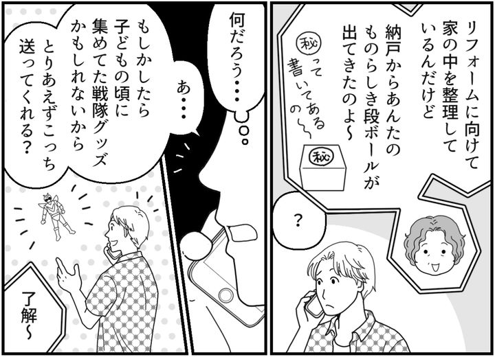 母から電話をもらったとき、俺には何の段ボールなのか心当たりがなかった。実家を出たタイミングで俺の部屋はなくなっているし、必要な物は全部こっちに持ってきている。ただもしかしたら子どもの頃に集めてた戦隊グッズかもしれない。レアアイテムが入っていたらもったいないから、一回確認してから処分しよう……。そう思って俺はとりあえず母に段ボールをそのまま送ってもらったのだ。