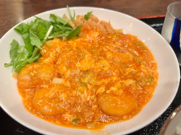辛さはオーダー時に調整可能なので、好みに合わせて注文できますよ。 ご飯の量もたっぷりで、男性でも満足できるボリューム感。 この内容で1,000円はコスパ最強レベルです。 一緒に行った夫が頼んだエビチリソース煮定食もご紹介します。