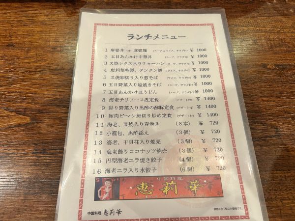 「中国料理 恵莉華」のランチメニューは、週替わり3種+定番10種から選べる充実のラインナップ。しかも、価格は1,000円〜とお手頃価格!
