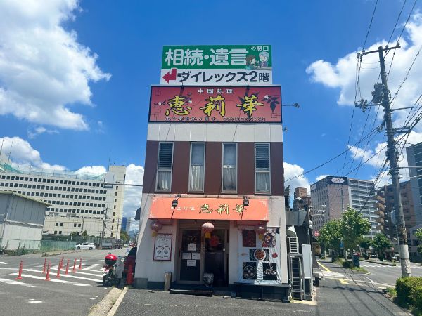 お店があるのは、広島電鉄「西観音町駅」から徒歩わずか3分の場所でアクセスも良好。ビルや小さな店舗が立ち並ぶエリアの中で、ひときわ目を引くのが「中国料理 恵莉華」です。