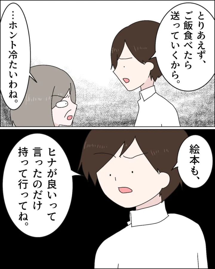 「とりあえず、ご飯食べたら送って行くから。」と、有無を言わさぬ雰囲気でヒロムが言うと、「ホント冷たいわね。」と、義母は不満でいっぱいの顔です。ヒロムは気にも留めずに「絵本も、ヒナが良いって言ったのだけ持って行ってね。」と念を押しました。