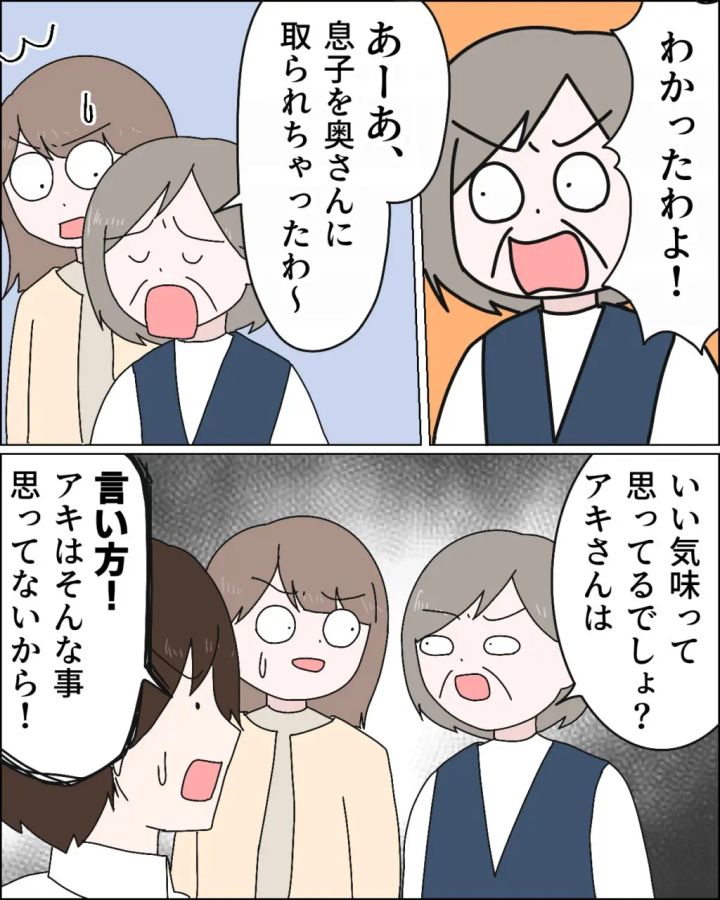 ヒロムに言われた義母は、「わかったわよ!」さらに不機嫌に。そして「あーあ、息子を奥さんに取られちゃったわー」と嫌味を言った後、「いい気味って思ってるでしょ?アキさんは。」と恨めしそうに私を見たので「言い方!アキはそんな事思ってないから!」とまた庇ってくれました。