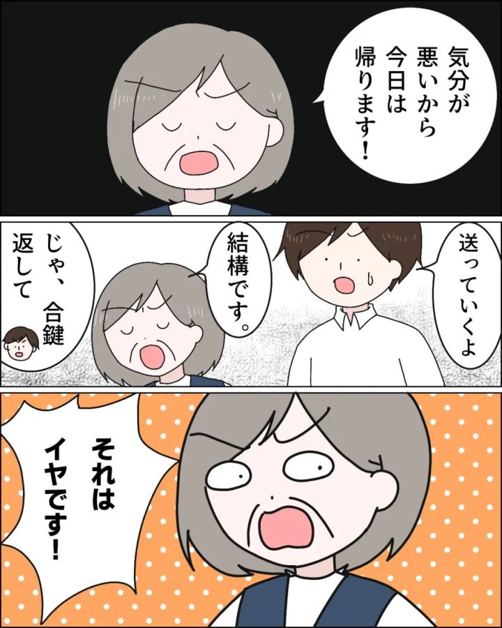 「気分が悪いから、今日は帰ります!」と言い出しました。「送って行くよ」と言うヒロムを「結構です」と突き放し、さっさと帰る支度を始めた義母に、「じゃ、合鍵返して」と追い打ちをかけるヒロム。「それはイヤです!」と、義母は頑なに勝手に作った合鍵を返そうとしませんでした。