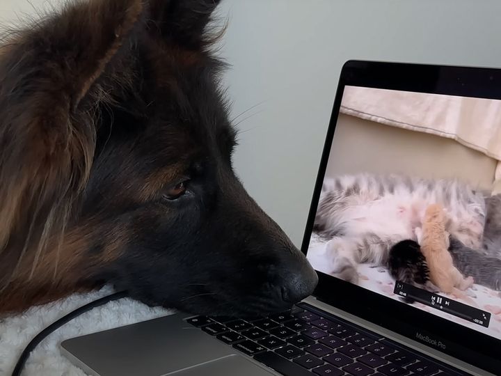 赤ちゃん猫の映像に夢中!「ここから出てくるの?」と待ち続けるシェパードさんの姿