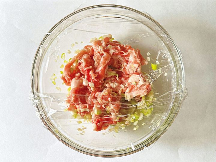 耐熱のボールに〈A〉、ねぎを入れて混ぜ、豚肉を加えて混ぜる。ふんわりとラップをかけて電子レンジ(600W)で6分加熱する。よく混ぜてほぐし、好みでレモン汁を加えてあえる。