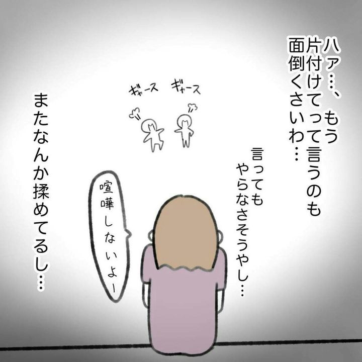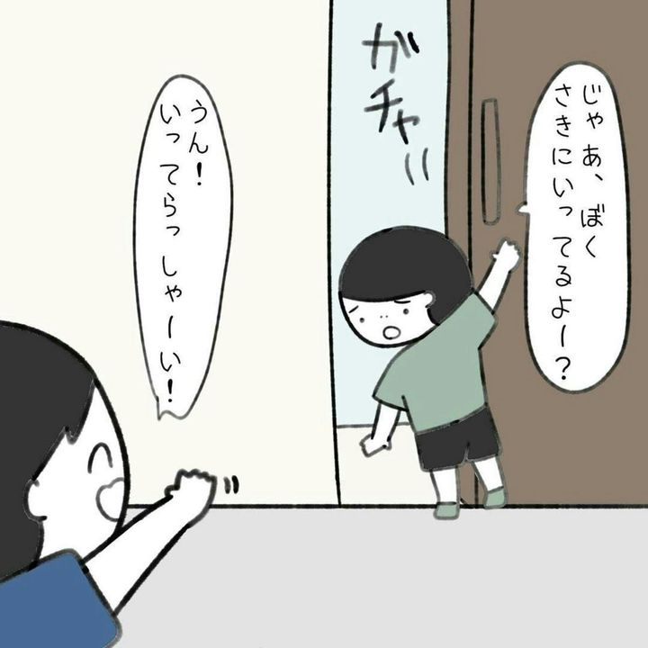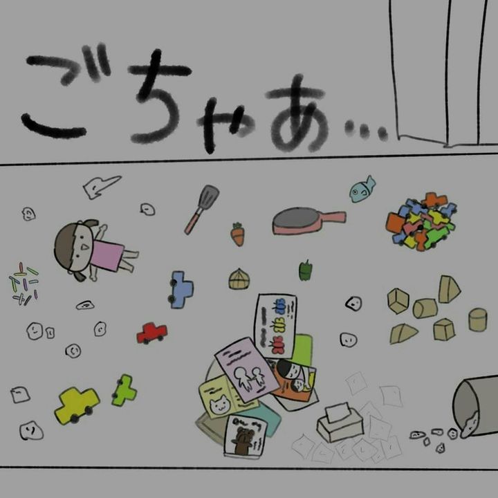 わが子とこうたくんを気にしながら、外と家を往復した かかじりさん。ようやく、こうたくんが外に出てきました。そして、チラッと室内を確認すると、おもちゃが散乱した部屋が…。
