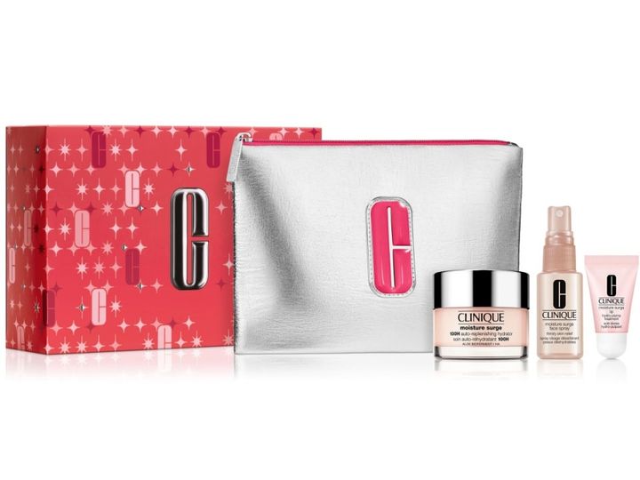 潤いケアとして人気の「モイスチャー サージ」から乳酸菌配合でしっとり潤す「保湿化粧水」、集中保湿のベストセラー「保湿ジェルクリーム」や、シカエキス配合でしなやかに潤い満ちる「保湿クリーム」、素早く肌に潤いを届ける「ウォータージェル美容液」の4アイテムから好きなアイテムが選べる嬉しいコフレ。秋冬には特に欠かせない「リップ トリートメント」とメイクの上からシュッとひと吹きできる「保湿フェース スプレー」、シルバーの「ポーチ」がセットに。