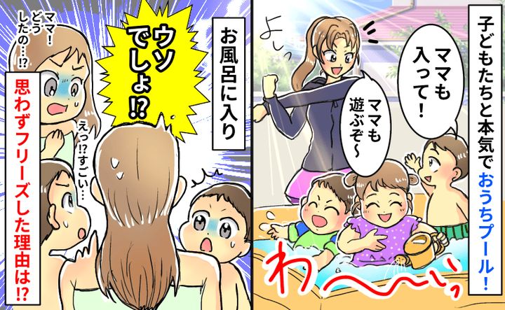 「え、誰…!?」おうちプールで子どもたちと本気の水遊び。その後、お風呂で自分の姿を見て絶句!なぜなら!?