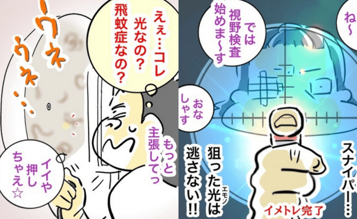 視野検査を受けているとき、スナイパーのような気持ちになるというへそさん。どうせなら検査は楽しい気持ちで受けたいですよね。