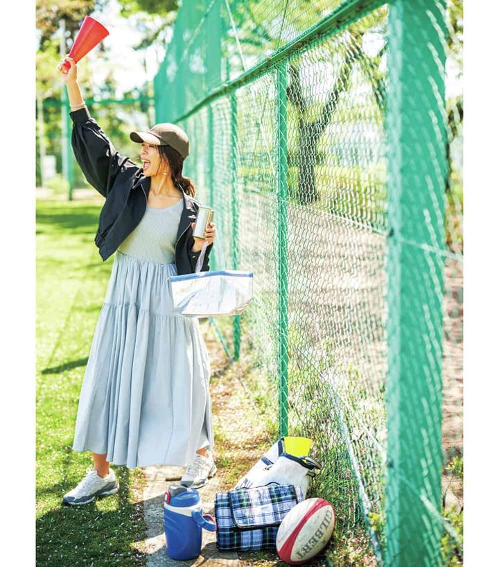 子のどもスポーツ大会やBBQなど、一日中野外の日は、甘めなブルーワンピをベースに、芝生でもしっかり歩きやすいスニーカー、UVカット&接触冷感の羽織りを合わせて、レジャーカジュアル仕様に。イノセントなワンピースは、存在感のあるダッドスニーカーで引き算すれば大人にちょうどいい甘さに!