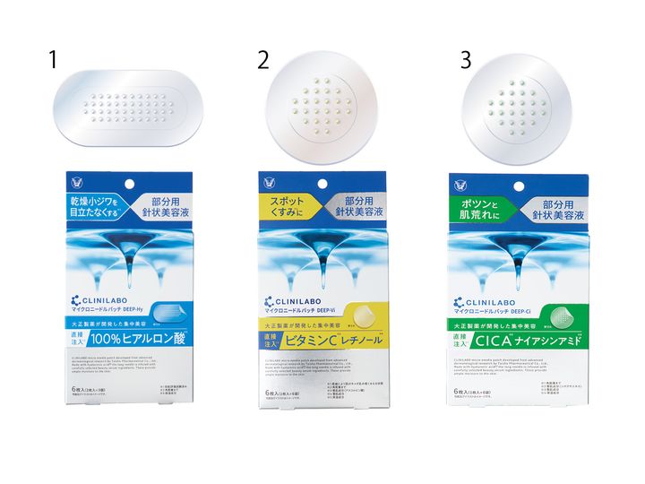 1.乾燥小ジワに100%ヒアルロン酸。マイクロニードルパッチ ディープ-Hy 2枚入り×3袋 ¥2,970 2.6種ビタミンとセラミドでくすみを一掃。ディープ-Vi 1枚入り×6袋 ¥2,970 3.6種の整肌成分でぽつんとできそうな肌荒れに。 ディープ-Ci 1枚入り×6袋 ¥2,970(すべて大正製薬)